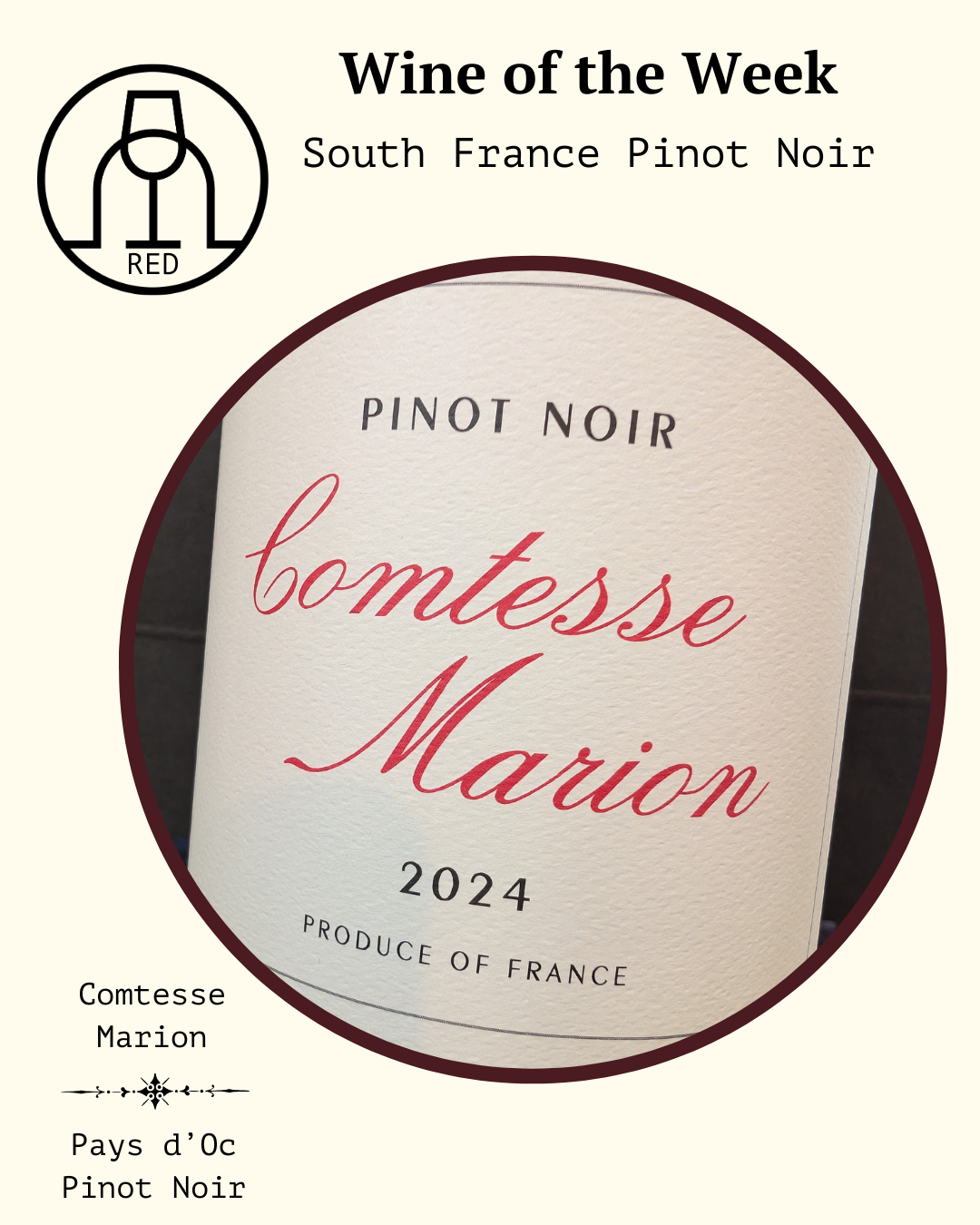Comtesse Marion makes this south of France red from Pinot Noir grown in the pastoral hills near the village of Vias, along the Mediterranean coast. The vines are 30+ years old and planted in volcanic soil. Cometesse Marion ferments the grapes in stainless steel and ages the resutant wine in steel as well.
