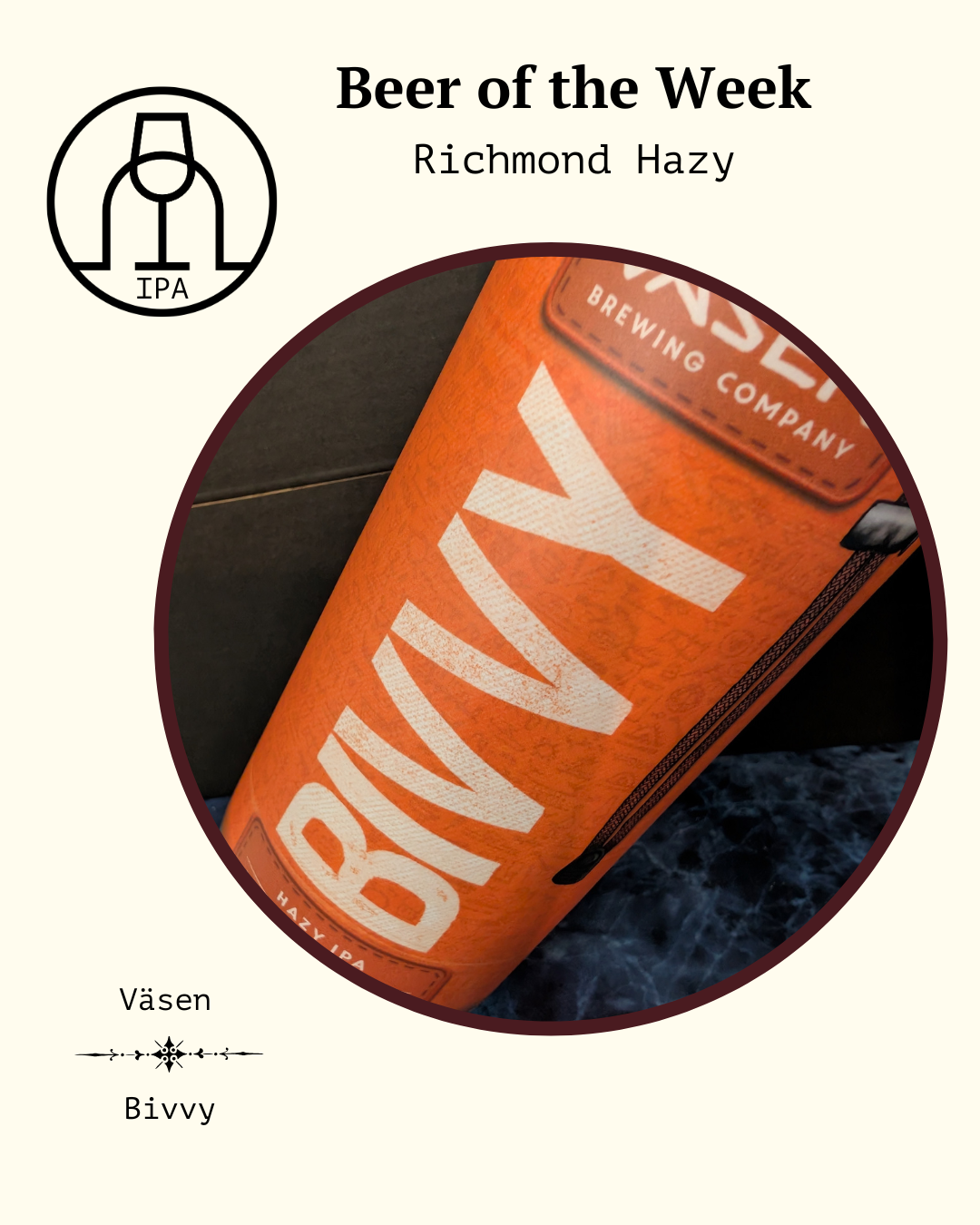 Väsen gives the Bivvy a light malt backbone to showcase their hop selection, which provides a hop character that strides citrusy and minty. (The citrus really hits you on the nose.) Dry, light, and hoppy — though we’ve had bigger beers from this Richmond brewery, somehow this feels like the quintessential Väsen IPA.